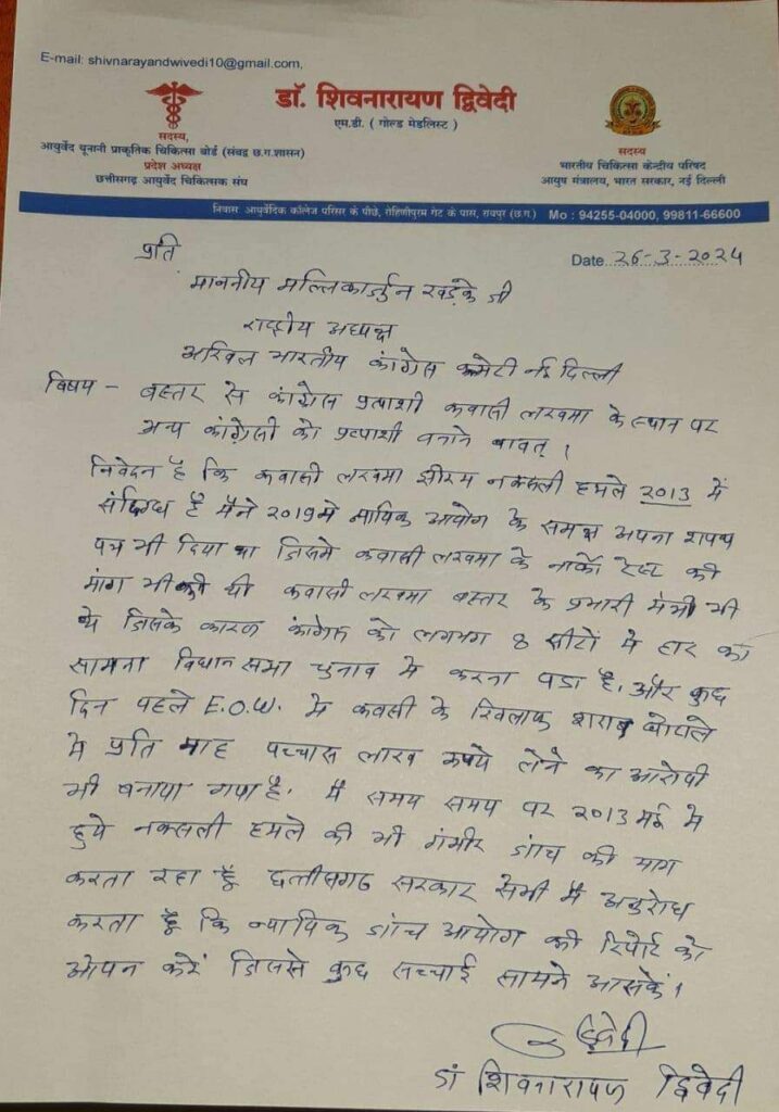 जिससे कवासी लखमा के लिए फिर नई मुसीबत सामने आ गई है दरअसल पार्टी के वरिष्ठ नेता शिवनारायण द्विवेदी ने पार्टी के राष्ट्रीय अध्यक्ष मल्लिकार्जुन खड़गे को लखमा के विरोध में पत्र लिखा है । इस पत्र में कवासी लखमा को अयोग्य प्रत्याशी बताया गया है । लखमा के लिए इस पत्र में लिखा गया है कि कवासी लखमा झीरम हत्याकांड में संदिग्ध है यही नहीं इसके साथ ही ईओडब्ल्यू में शराब घोटाले में 50 लाख रुपए हर महीने लेने का आरोप भी लखमा के ऊपर है ऐसे में कवासी लखमा योग्य प्रत्याशी नहीं है पार्टी को चाहिए की उनके स्थान पर किसी योग्य व्यक्ति को बस्तर से उम्मीदवार बनाए । बरहाल ये पत्र तेजी से इंटरनेट पर वायरल हो रह है ।